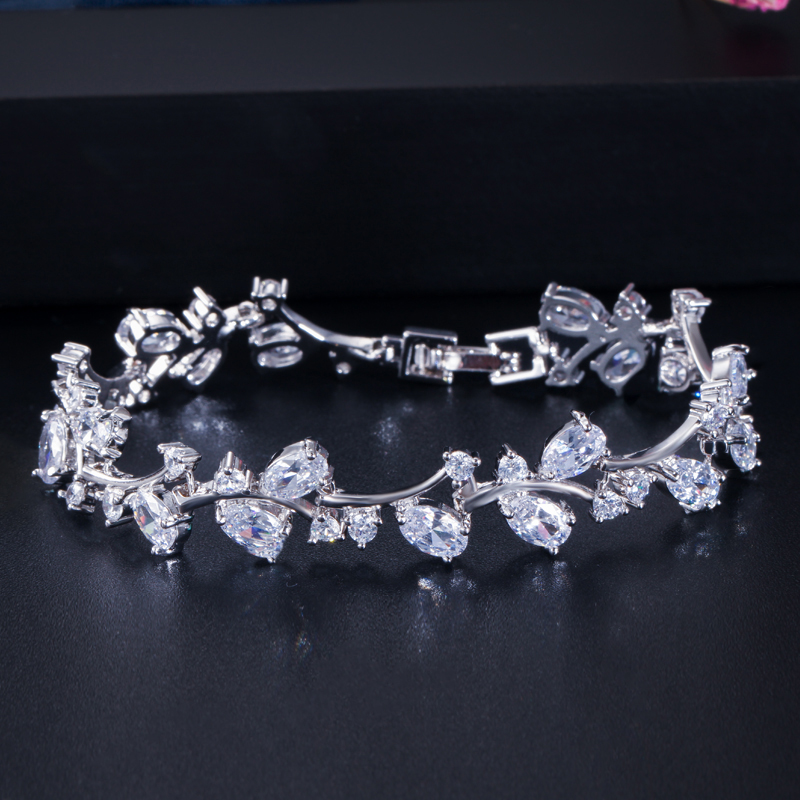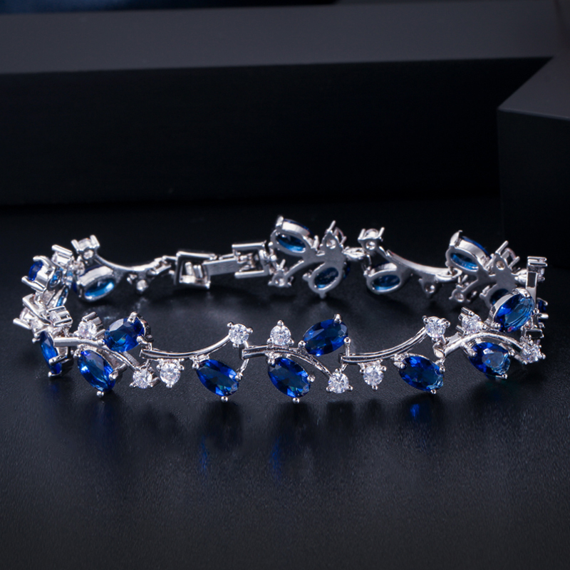 Silver plant design bracelet , set with sparkling clear cubic zirconia, and blue topaz stones