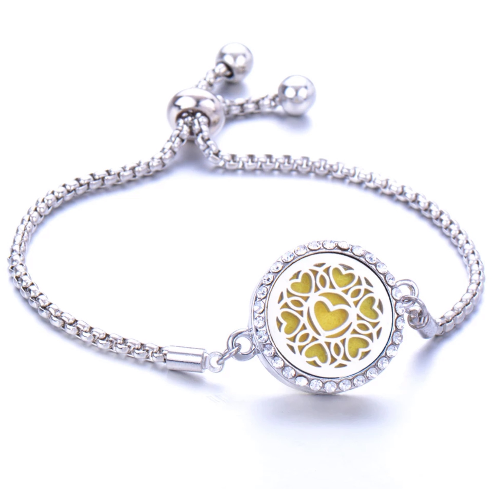 A unique, locket style essential oil bangle so you can now wear your essential oils anywhere. Each aromatherapy necklace/bracelet includes 5 asstd. colours, washable and reusable highly absorbent synthetic felt pads