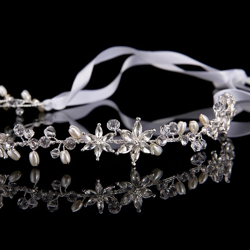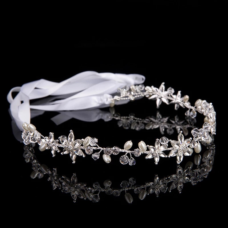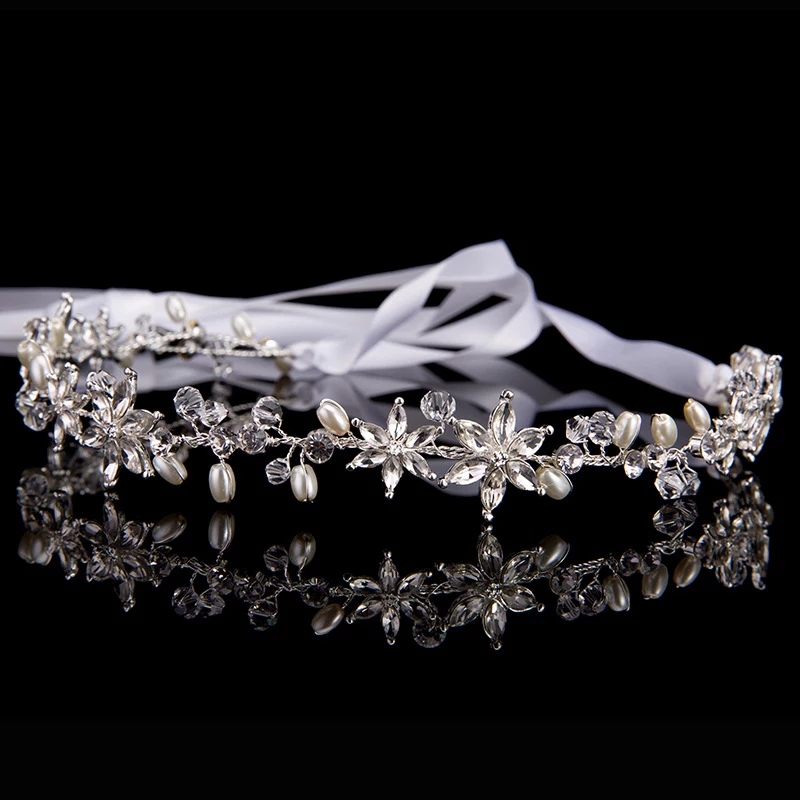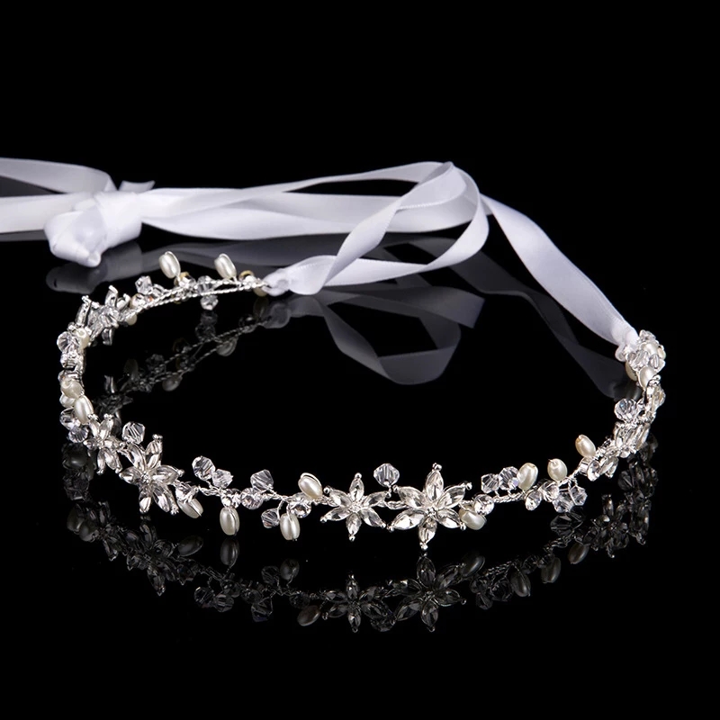 Silver crystal tiara headband, with pearl and crystal flowers, and white ribbon tie.