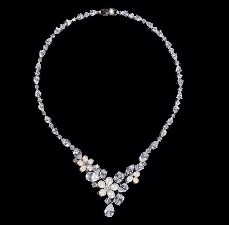 Exquisite Pearl Flower Necklace, with a mix of oval and pear shaped AAA Swiss Cubic Zirconia stones